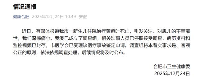 12月24日,合肥市衛(wèi)健委發(fā)布情況通報:近日,有媒體報道我市一新生兒住院治療黃疸時死亡,引發(fā)關注。對患兒的不幸離世,我們深感痛心。我委已成立了調查組,相關涉事人員已停職接受調查,病歷資料和監(jiān)控視頻已封存,市醫(yī)學會已受理該醫(yī)療事故鑒定申請。...